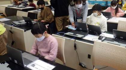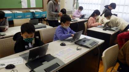今日は2年生がコンピュータ室でタブレット端末を使って活動しています。今日は主にログインの仕方を練習しました。