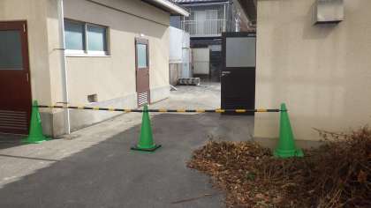 運動場(うんどうじょう)をきれいにする工事(こうじ)が始(はじ)まりました。今日(きょう)から運動場(うんどうじょう)に入(はい)れないように,パネルやコーンを置(お)いています。
