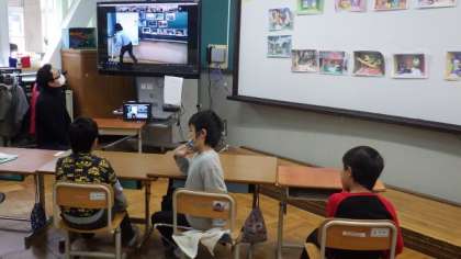 「小さな巨匠展」に向けた例年の合同作品づくりは,感染防止対策として,リモートで作品交流を行いました。自分たちが作った作品を見せながら紹介しました。