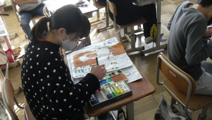 黒インクで刷り上がった版に,絵の具をぬり,表情豊かな作品に仕上げています。
