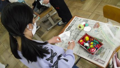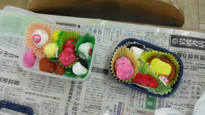 紙粘土でいろいろな食べ物の形を工夫して着色し,おいしそうなお弁当を作りました。