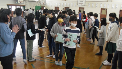 最後に5年生の花道で見送られました。途中,それぞれの縦割りグループから,メッセージカードのプレゼントをもらいました。