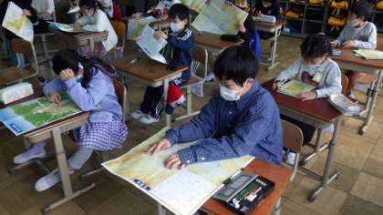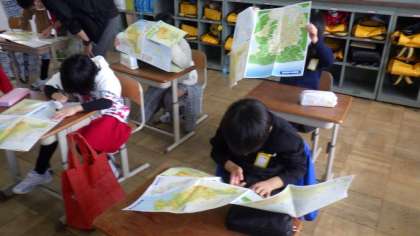 3年生の教科書等に名前を書いたり,プリントを配ったりしています。社会の学習で使う地図を見て,見たことのある地名をみつけて嬉しそうな様子でした。