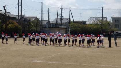 運動場で体育の学習をしています。