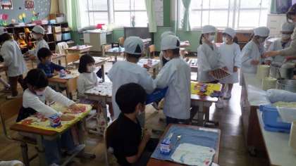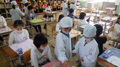 19日(月)1年生 給食の用意の様子
