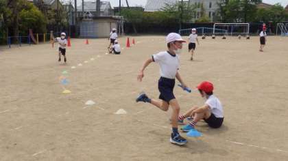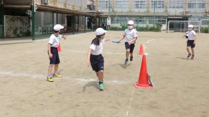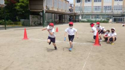 バトンパスの仕方を工夫して,相手チームと競走することを楽しんでいます。