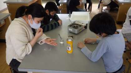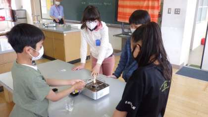 空気のあるところと空気がないところで,木を熱してみて,空気がないときには炭になるのか確かめる実験をしています。