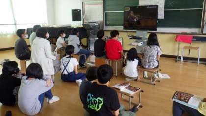 動画をみて,オーケストラの楽器について学習しています。