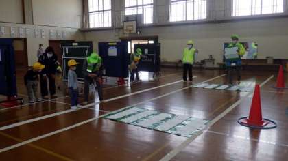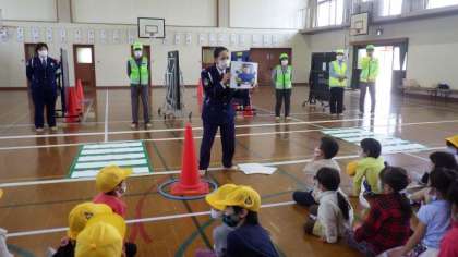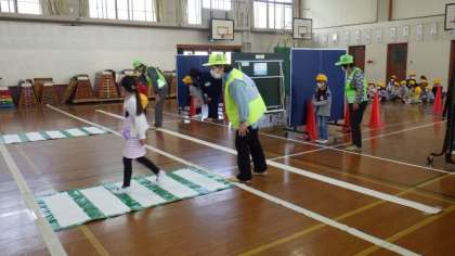 北警察署,鳳徳交通安全協会の皆様を講師にお招きし,1年生の交通安全教室を行いました。交通ルールについての話を聞いたり,体育館にコースをつくって,横断歩道を渡ったりする練習をしました。