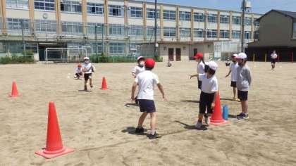 バトンパスの仕方を工夫して,相手チームと競走することを楽しんでいます。