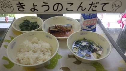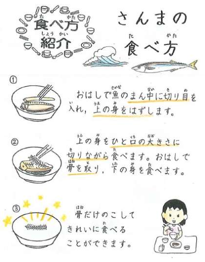 各教室で提示している「給食カレンダー」では,さんまの食べ方を紹介しました。