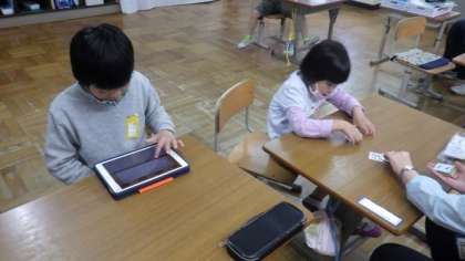 一人一人に合わせた学習をしています。カードを使ってひらがなの学習をしたり,タブレットで日記を書いたり,ワークシートを使って漢字の学習をしたりしています。