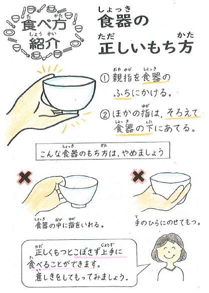 今日の「給食カレンダー」では,食器の正しいもち方を紹介しました。