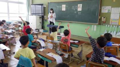 漢字の学習をしています。これまでに習った漢字の部分がないか,たくさんの子どもたちが見つけて発表していました。