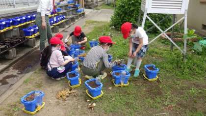 2年生で栽培する学習をするために準備をしています。学習園や一人一鉢の草ひきをしています。