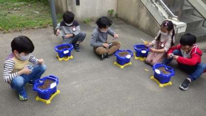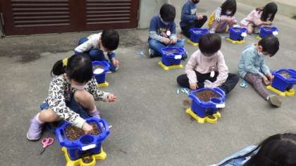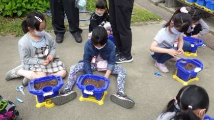 一人一鉢でアサガオを育てます。今日は,自分の鉢に土をいれたり,種まきをしたりしました。