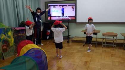今日はプレイルームで体育の学習をしています。「だんごむし体操」の曲に合わせて楽しく体を動かしています。