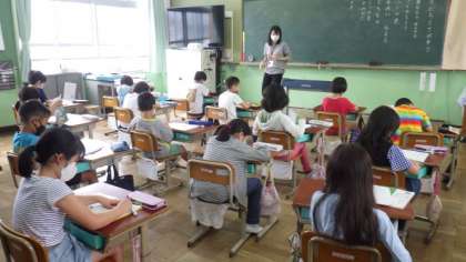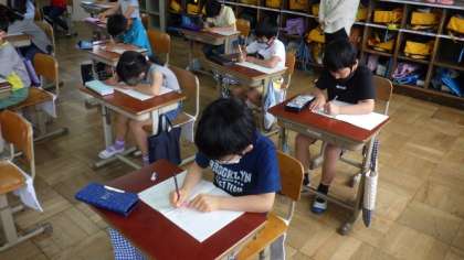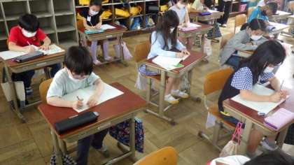 「迷子のお知らせ」の音声をきいて,ノートにメモをとっています。どのようなことに気を付けて聞くとよいか話し合いました。