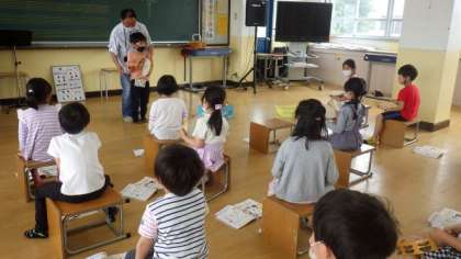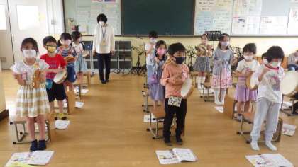 今日は音楽室で学習しています。「ぶんぶんぶん」の曲のリズムの違いを感じ取りながら,手拍子やタンブリンを使ってリズム打ちをしています。