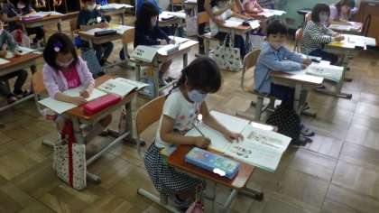 教科書の例文を読んで,「〜が〜。」という文型から文を考える学習をしています。ノートに丁寧に書いていました。
