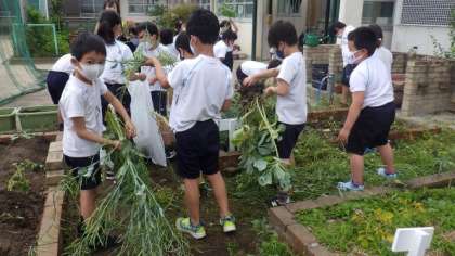 暑いくらいの天気になり,学習園の植物もぐんぐん伸びています。今日は学習園の草ひきをしています。
