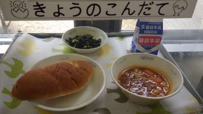 「チリコンカーン」は,大豆や牛肉,野菜をじっくり煮こんで作りました。ふっくらとした大豆のやわらかさを味わって食べてほしいと思います。