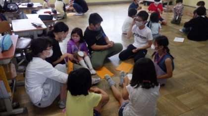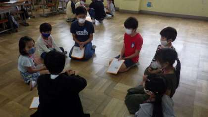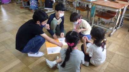 各教室では,たてわり班でゲームをしました。名前ゲームやヒントクイズ,しりとりなど,大声を出したり接触したりしないゲームを行いました。6年生が1年生に優しく声をかけていました。