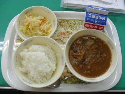 「ハッシュドビーフ」は,子どもたちに人気の献立です。ルーから調理員さんの手作りで,野菜も牛肉もとても柔らかく,おいしく煮込んであります。ごはんにかけていただきました。