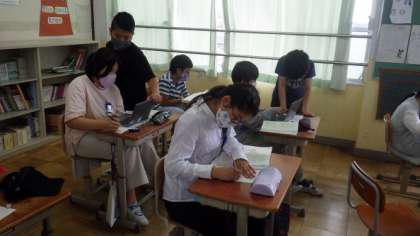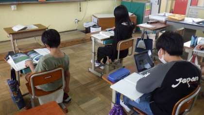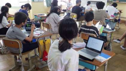 身の回りで自分たちが取り組めそうなテーマについての提案文を書くために,学校図書館の本やインターネットを使って資料を集めています。