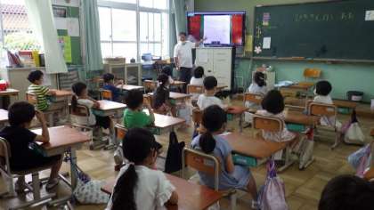 「プールのきまり」のプリントを見ながら,水泳での学習の約束を確認しています。