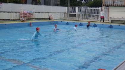 1・2時間目は5年1組が今年度最初の水泳学習を行いました。着替え・準備体操まではマスクをつけて行いました。プールの中を走ったり,けのびをしたりした後は,クロールや平泳ぎの練習をしました。