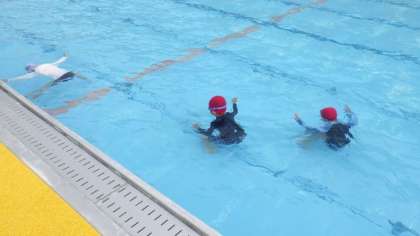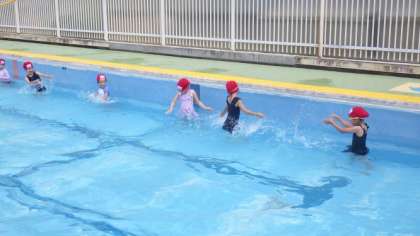 今日の1・2時間目は1年2組が水泳学習を行いました。水慣れで友達と水をかけ合ったり,いろいろなうき方の練習をしたりしました。最後にバタ足の練習もしました。