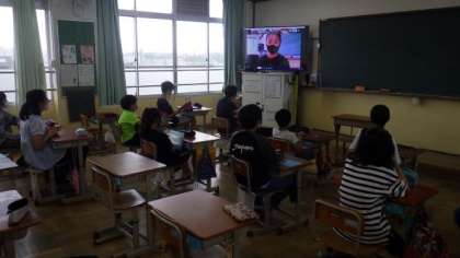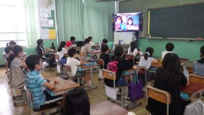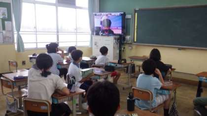 朝会の後に,リモートで児童集会を行いました。各委員会の6年生から全校によびかけました。