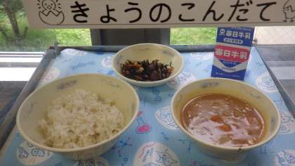 今日の「チキンカレー」は,とり肉・じゃがいも・にんじん・たまねぎを手作りのルーでじっくりと煮こんで作っています。