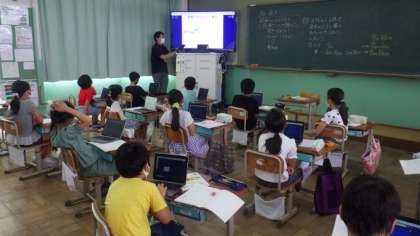 タブレットのシンキングツールを使って,身の回りの物の長さを予想し,入力しています。