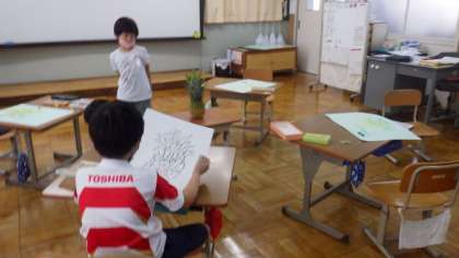 パイナップルの絵をかいています。細かいところまでよく見て描いていました。また,実際にさわって形や色の感じを確かめながら描いていました。