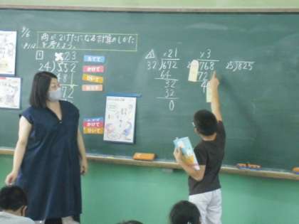 4年生は,商が2けたになるわり算の筆算の仕方を考えました。商がたたないところには,「できま手裏剣」(×印)をつけることにより,商を書く場所を間違えないように意識しながら,計算を進めていました。