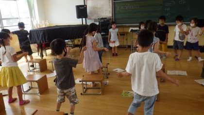 音楽室で学習しています。「やまびこごっこ」の曲に合わせて,友達が考えた動きを真似して楽しんでいます。
