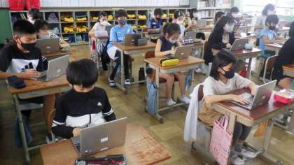 一人1台のタブレット端末を使って,リモートに参加する練習をしています。