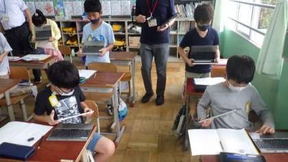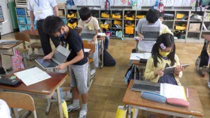 あまりのあるわり算の学習をしています。ノートに自分の考えをかいた後に,タブレットのカメラ機能で自分のノートを撮影し,先生のタブレットに写真データを提出しています。大型テレビにノートを映し,友達の考えと比べていました。