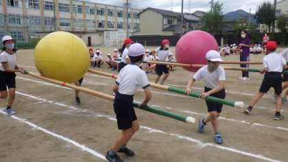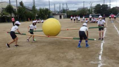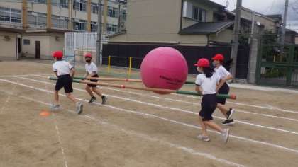 体育参観に向けて,5年生が団体競技の練習をしています。5・6年生の団体競技は,棒を使って大玉をリレーします。友達と協力しながら練習していました。