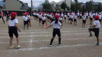 はじめに全校ダンス(準備体操)をしました。運動委員会の子どもたちが手本として前に出て体操を行いました。
