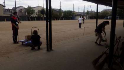 明日の体育参観に向けて,教職員で会場準備をしています。