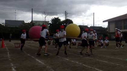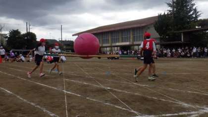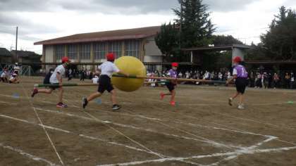 お互いに声をかけ合いながら,協力して大玉を運んでいました。