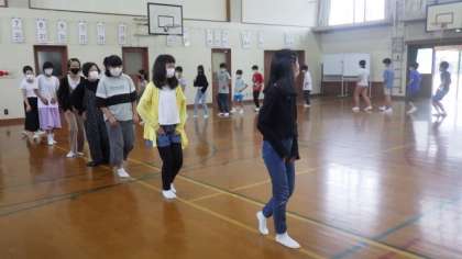 すばらしい演技を鑑賞させていただいた後は,狂言の歩き方や曲がり方などの動きを教えていただきました。手の位置や姿勢を意識しながら,そして腰を落として歩くというのはとても大変な様子でした。この体験は,2回にわたって教えてくださいます。次回,どんな体験をさせていただけるか,楽しみにしています。