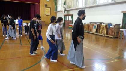 台詞のお稽古の後は,役に分かれて動きもつけて台詞を言う練習をしました。前回教えていただいた歩き方や姿勢も思い出しながら練習しています。