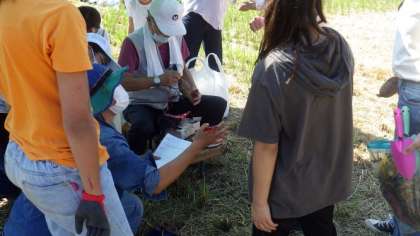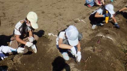 暑いくらいの良い天気の中,子どもたちは楽しそうにいもほりをしていました。いもほりをした後は,重量を量って「おいもコンテスト」を行いました。