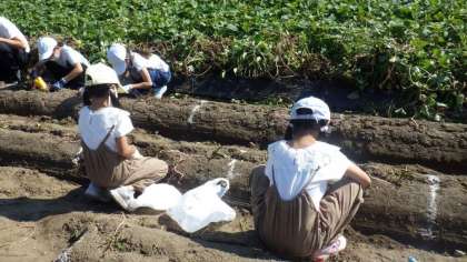 鳳徳少年補導委員会の皆様,PTAの皆様にお世話になり,いもほりに行きました。例年はハイキング等も行っていますが,感染防止対策として,参加人数を制限したりバスを増やしたり,昼食をみんなでとらず午前中で活動を終了したりと工夫して実施していただきました。学校に集合した後,バスで静原の堀内農園へ向かいました。