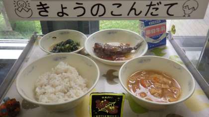今日の「いものこ汁」は,京都市右京区の京北地いきで作られた「京北みそ」を使った,地産地消(ちさんちしょう)の献立です。