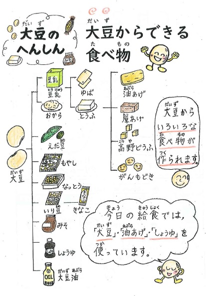 今日の給食では,「大豆」「油あげ」「しょうゆ」を使っています。